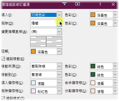 - 將刪除的選項改為隱藏,其他的變更指標直條改為無,然後按確定即可