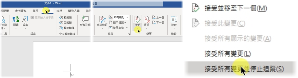 檢查完變更的地方之後可以在檢閱→變更頁籤,點選接受下方的小箭頭,選擇全部接受並關閉追蹤修訂即可。